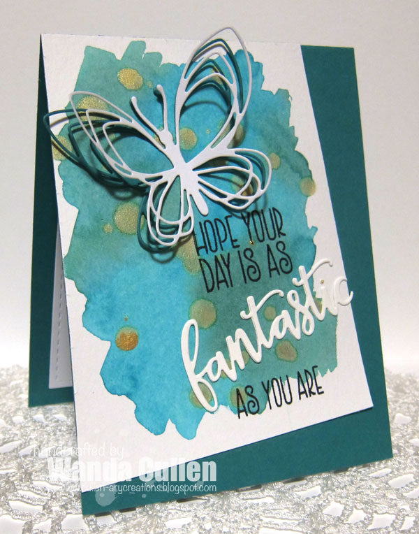 I love this so much it prompted me to buy my first ever Verve products! Had to go right over and get both the stamp and die sets. Sheesh! Awesome use of the colors, Wanda. Love the gold splotches and that stringy butterfly, too!