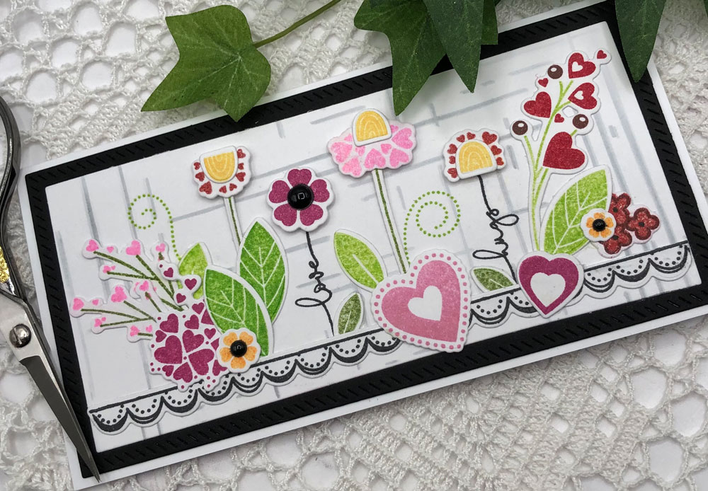 Next is a mini slimline card which works to showcase the whimsical flowers with a couple of the sentiment stems.