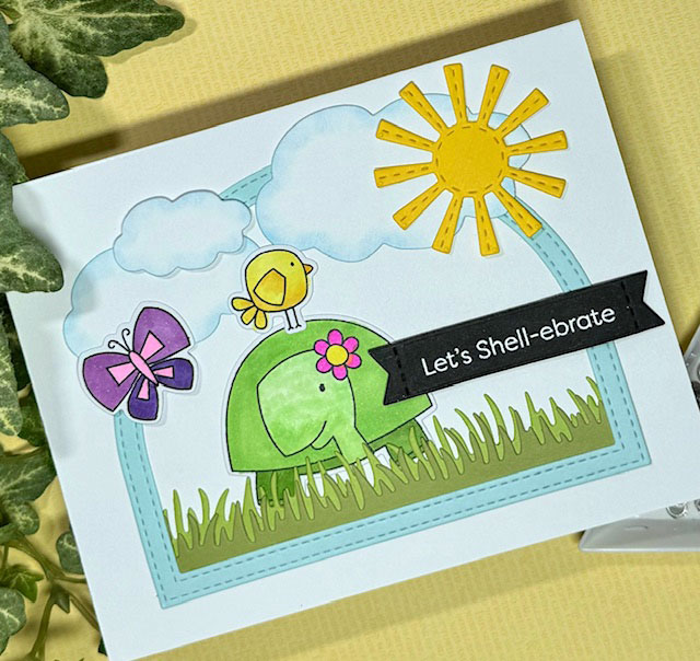 DIES: Stitched Dome Frames, Clouds, Grass, Too-Cute Turtles, Stitched Sentiment Strips (My Favorite Things); Stitched sun (Lil Inker Designs).