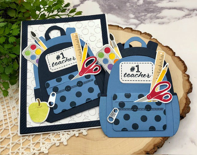 I cut and assembled two backpacks and adhered one to a card base and left the other one free standing. Both have the ability to insert a gift card through the open slot in the top of the bag. I used the Cover Plate: Apple die and adhered it to an adhesive sheet so it would hold the apples in place to give it an embossed look. I love the details on this bag...so fun to arrange all the elements!