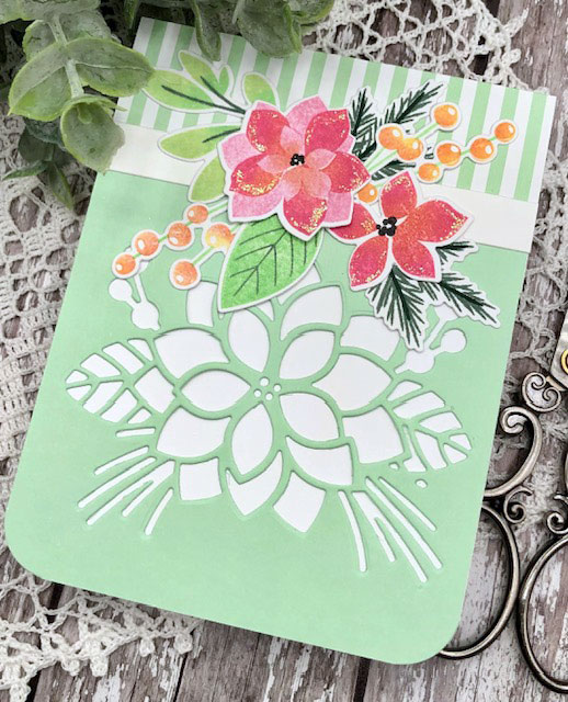 First up is a favorite of mine with the beautiful new elegant edge die paired with new holiday florals! I opted to omit the "vein" step stamp with the poinsettias and just added some crystal Stickles.